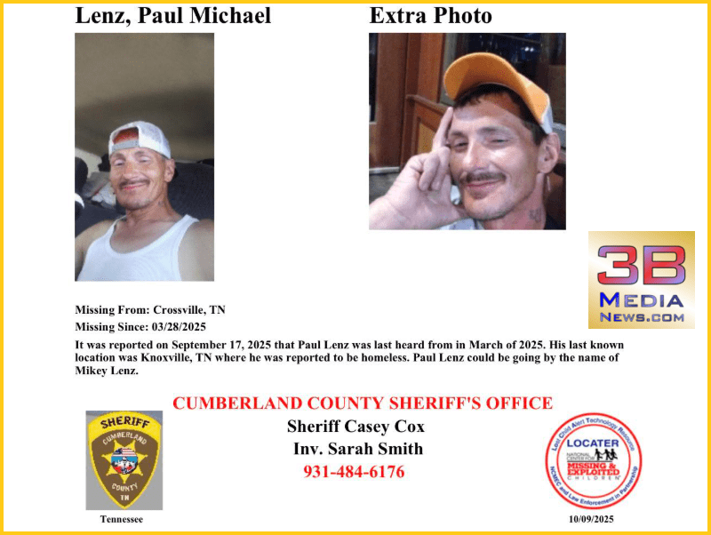 From the Cumberland County Sheriff's Office: Missing Person Missing From: Crossville, TN Missing Since: 03/28/2025 It was reported on September 17, 2025 that Paul Lenz was last heard from in Mar ...