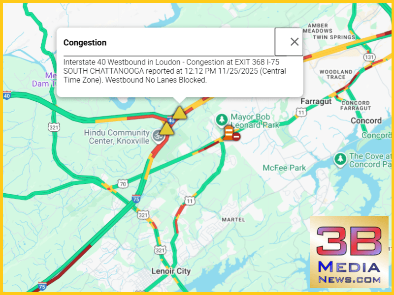 TDOT reported congestion at the busy I-40/I-75 split west of Knoxville in Loudon County. At 12:12 PM CT, I-40 westbound slowed at Exit 368 (I-75 South to Chattanooga), and at 12:08 PM CT, I-75 southbo ...