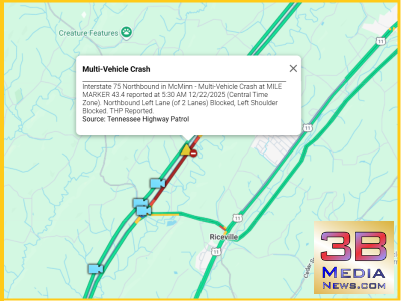 On December 22, 2025, a multi-vehicle crash occurred on northbound Interstate 75 in McMinn County, Tennessee, at mile marker 43.4, reported by the Tennessee Highway Patrol at approximately 5:30 AM Cen ...
