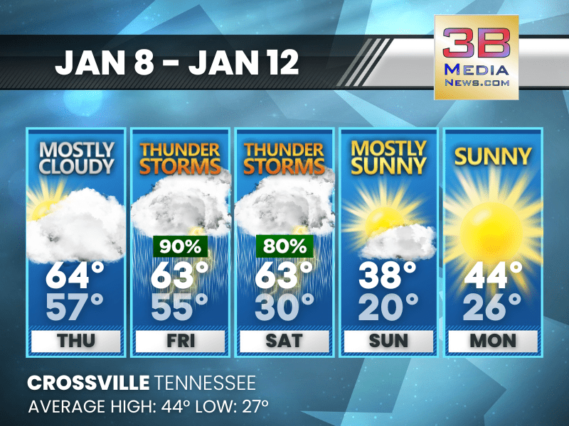 Crossville faces thunderstorms Friday and Saturday before temperatures crash into the 30s and 20s by Sunday. Thursday: Mostly cloudy, with a high near 64. South wind 5 to 10 mph, with gusts as high ...
