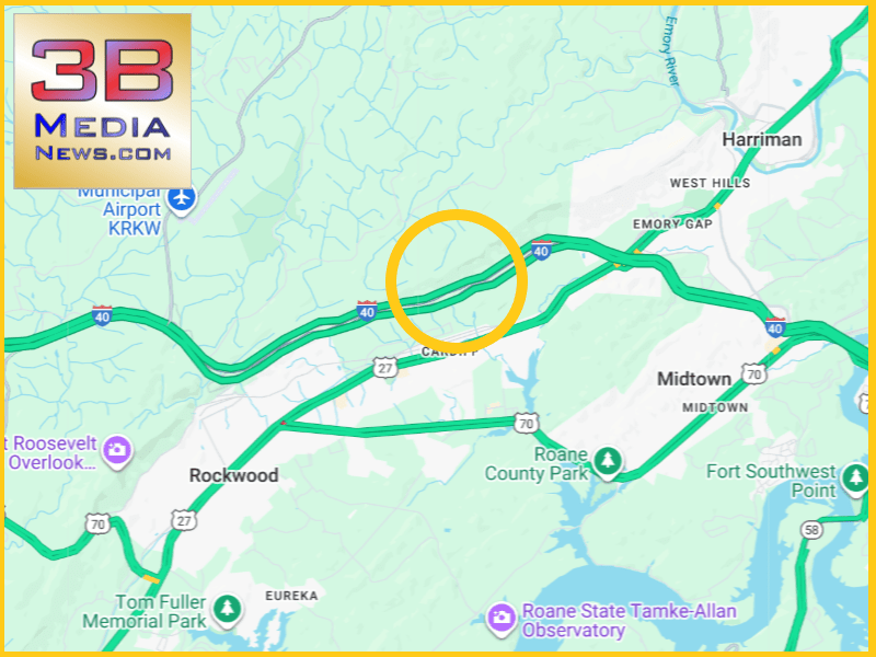 This is an emergency dispatch alert for a motor vehicle accident with injuries on I-40 Eastbound at mile marker 344 in Tennessee (Roane County area, near Rockwood/Harriman). A semi-truck has gone ...