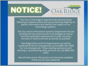 OAK RIDGE WILL WAIVE LATE FEES DUE TO MALWARE ATTACK ON CITY’S COMPUTER SYSTEM