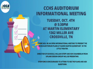 CCHS Auditorium Informational Meeting Tuesday, October 4th @ 5:30 pm located at Glenn Martin Elementary School's Little Theater.