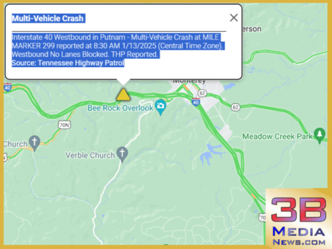 The TDOT Smart Way map reports a multi-vehicle crash on westbound Interstate 40 near mile marker 299 just past Monterey taking place around 8:30 a.m. No lanes seem to be blocked. The Smart Way map ...