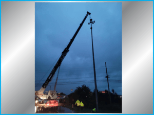 ALLIED CRANE WORKS INTERSTATE WRECK DURING TORNADO WARNING TO KEEP LIGHT POLE FROM FALLING.