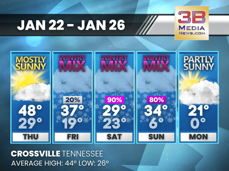 Crossville faces off-and-on flurries and a sharp weekend cooldown before a brighter but still chilly MLK Day. Thursday: A chance of flurries before 7am. Mostly cloudy, then gradually becoming sunny ...