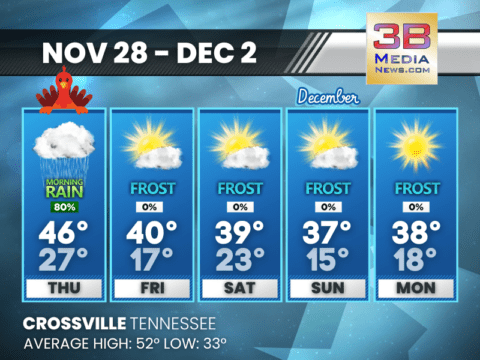 Expect light rain early Thursday, with temperatures dropping into the teens by the weekend; widespread frost and sunny afternoons dominate the extended forecast. Thanksgiving Day: Showers, mainly b ...