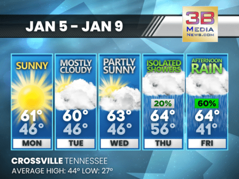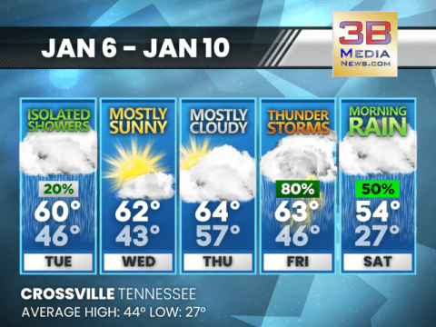 Crossville warms into the low to mid 60s through midweek before rain chances increase late Thursday into Friday. Today: Sunny, with a high near 61. Southwest wind 5 to 10 mph, with gusts as high as ...