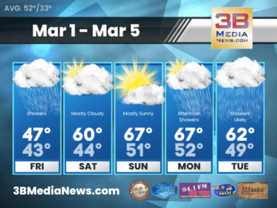 Rain returns Friday. Warming trend and drier conditions this weekend. Friday: Showers. High near 47. South southeast wind around 10 mph, with gusts as high as 25 mph. Chance of precipitation is 90 ...