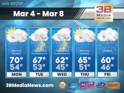 Warm and wet going into the new week. Monday: A 20 percent chance of showers after noon. Partly sunny, with a high near 70. South wind around 10 mph. Monday Night: A slight chance of showers bef ...