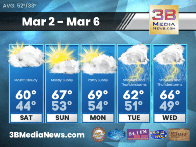 Heavy rain and thunderstorms possible this weekend. Friday: Showers likely, mainly after 2pm. Cloudy, with a high near 62. South southeast wind 5 to 15 mph, with gusts as high as 30 mph. Chance of ...