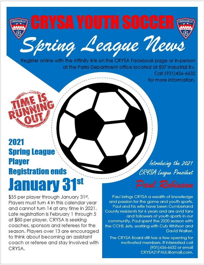 CRYSA (Crossville Recreational Youth Soccer Association) is pleased to welcome Paul Robinson to the leadership team as league President. Paul comes from San Diego, once home to the USA Men and Women’s National Soccer teams. He and his wife have been part of the Cumberland County community for 6 years now. He is also a volunteer with the VIP Program, sponsored by the Crossville Police Department and has been helping coach with the CCHS Jets Soccer Program with Coaches Cub Whitson and David Walker for this past year. Paul is very excited to work with the current volunteer board to continue enriching the lives of the communities youth through the sport of soccer. CRYSA is thankful for the communities support and still have a few openings to complete the team. Please contact them at (931) 456-6632 or email Paul at [email protected]