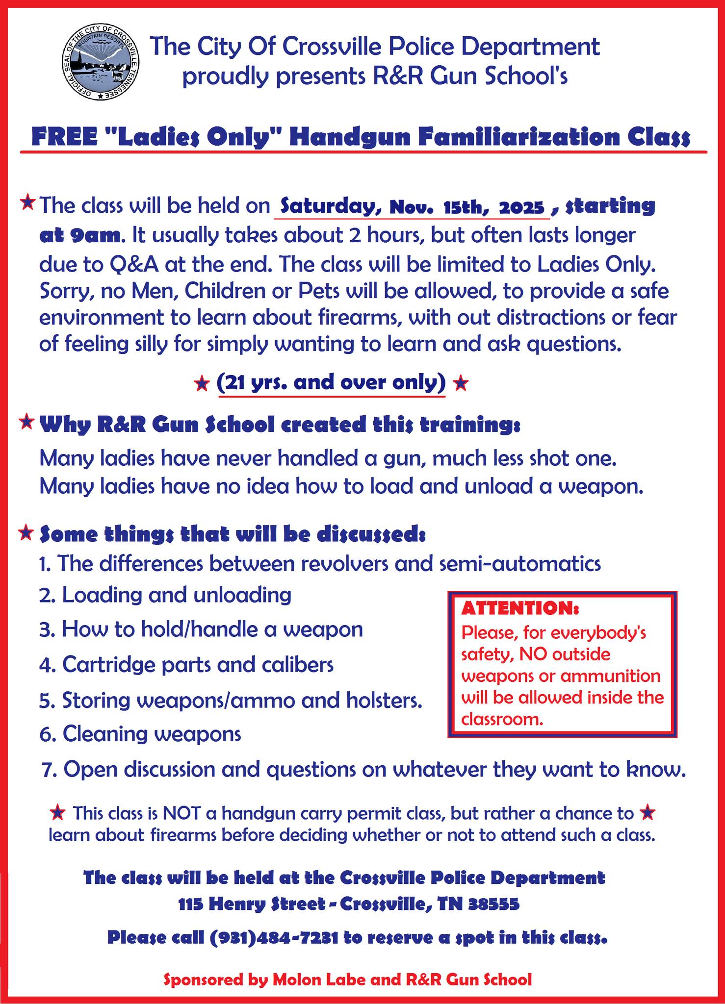 The Crossville Police Department will be hosting a Ladies ONLY Gun Class on Saturday, November 15, 2025 – beginning at 9am, at the