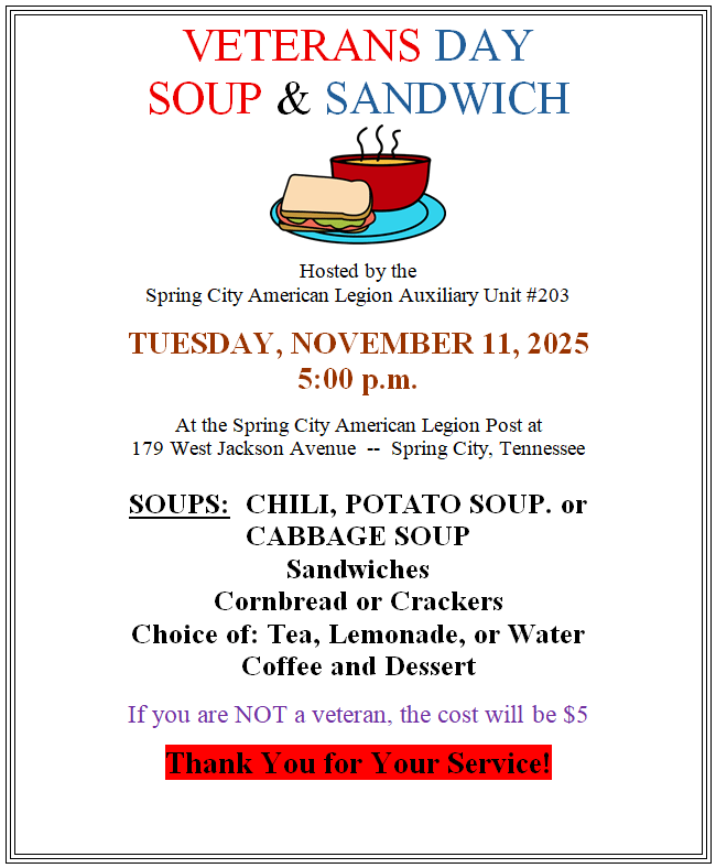 VFW POST VETERANS DAY CELEBRATION – 11 November 2025 Catered by the Flying Pig (smoked chicken and sides) Open to the Public & non-smoking from 1PM to 4PM. Come and celebrate those