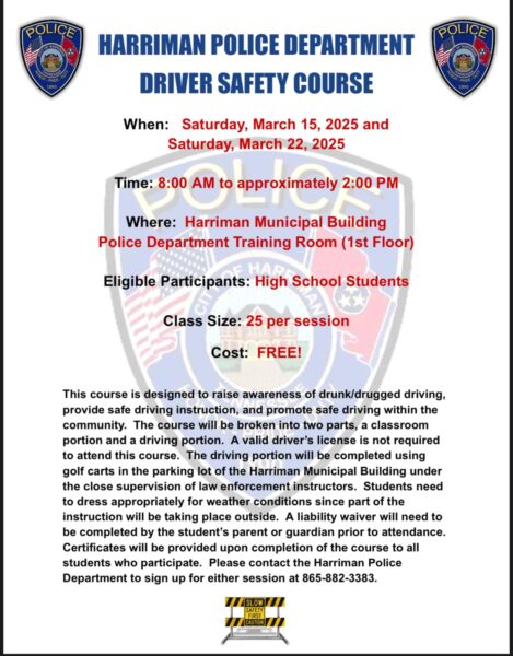 If you would like to sign your student up for either class, please contact the Harriman Police Department at (865) 882-3383.