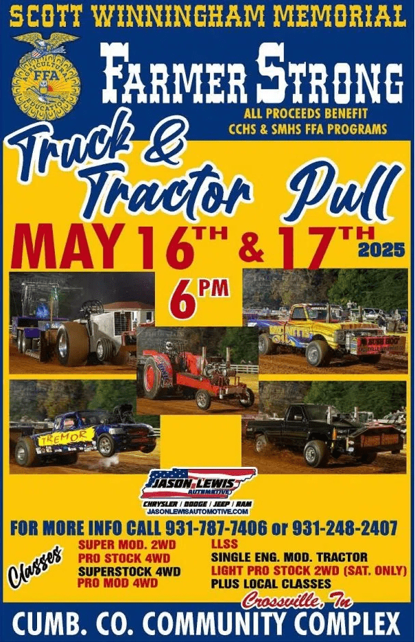 May 16th and 17th some of the best pullers in the country will be rolling into Crossville, TN at the Cumberland County Community Complex! Admission is just $10 kids 11 and under are free! Action starts at 6pm both nights! We will have food trucks on site! All proceeds benefit our local FFA and Agriculture Education programs!! We will be having blown and naturally aspirated 4wd and 2wd trucks, Light Limited Super Stock Diesel and Alcohol Tractors, Single Engine Modified Tractors, as well as our local classes! Come join us!
