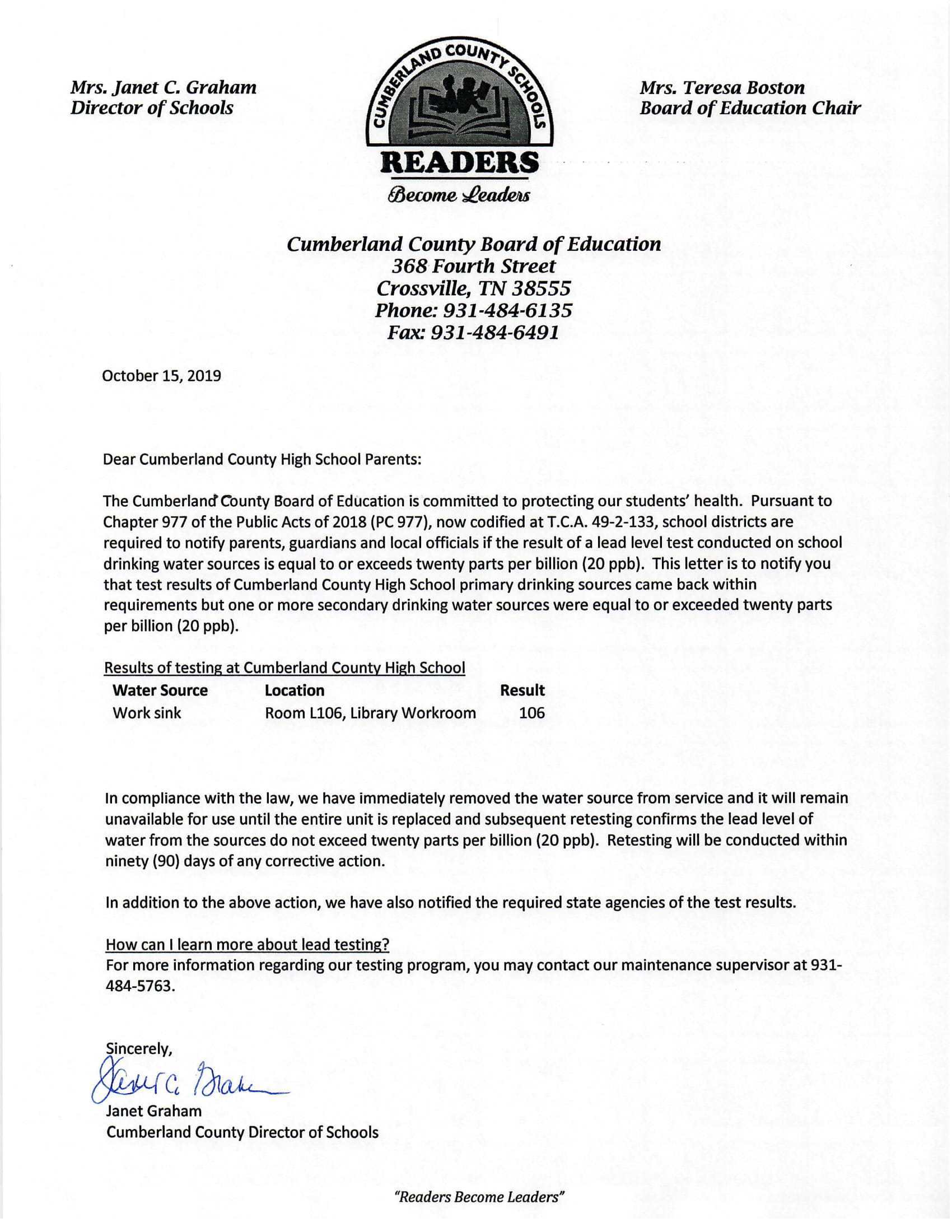 Parents of students attending Cumberland County High School will receive a letter informing them of exceeding levels of lead detected in water there. The source of the water is in a work sink in the library (Room L106).