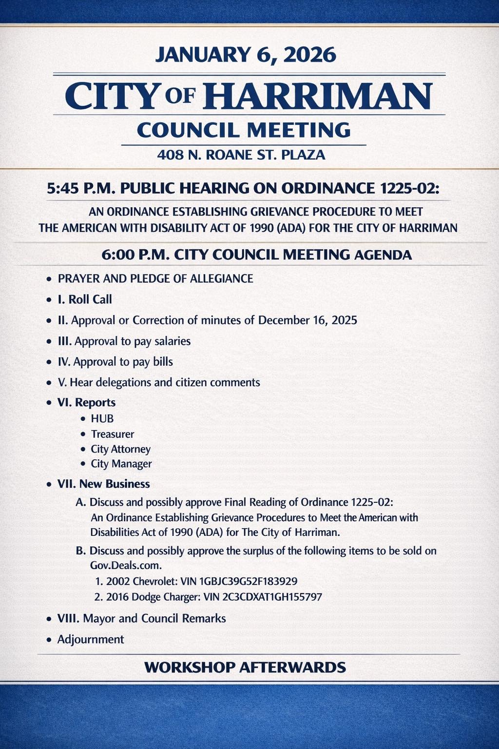 The City of Harriman, Tennessee, has scheduled a council meeting for January 6, 2026, at 6:00 p.m. in the Municipal Office Complex Plaza at 408 N. Roane Street.