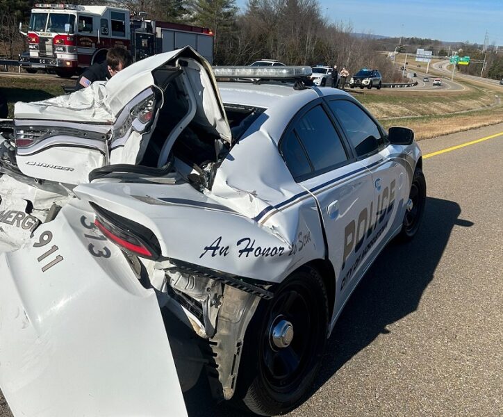 Authorities say a police officer’s cruiser was hit Wednesday in Morristown by a motorist in a truck failing to move over. The police cruiser was positioned near an accident crash site on Highway 25E.