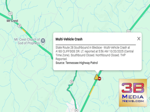 In Bledsoe County, State Route 28 is closed in both directions near Cliffside Drive due to a multi-vehicle crash reported just before 6 AM. Drivers are advised to find an alternate route such as the following: