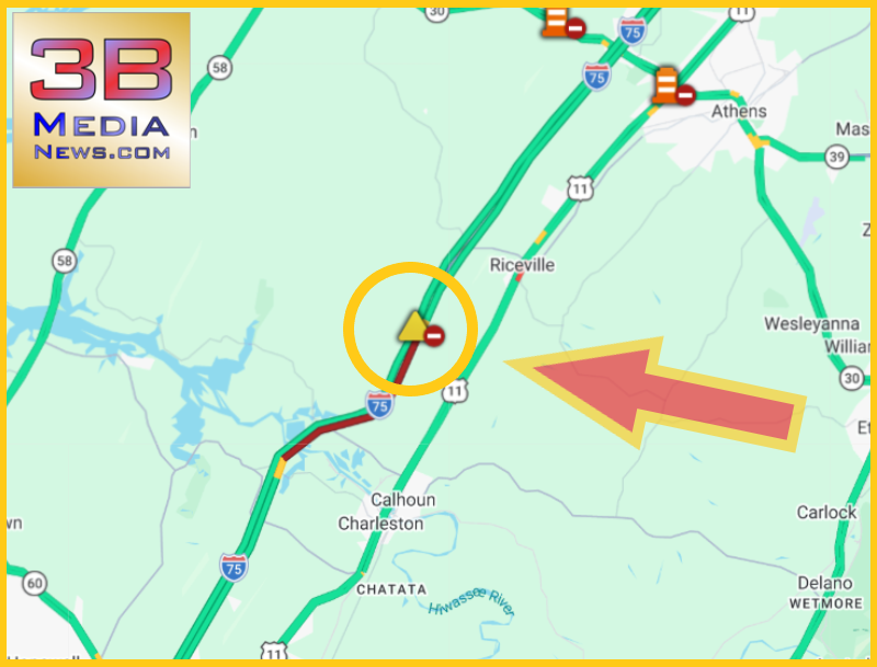 An overturned vehicle was reported on Interstate 75 Northbound in McMinn County, near mile marker 39.6, at 2:30 PM ET on April 15, 2026. The incident has blocked the northbound left lane (out of two lanes) as well as the left shoulder.