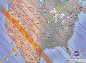 The “ring of fire” will be visible from Texas north northwest to Oregon (see the orange area on the map with this story). This is where the moon nearly covers the sun, creating a ring of fire effect.