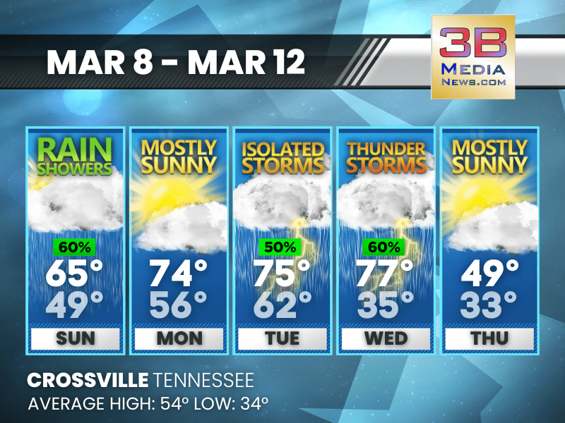 Weather information is provided by the National Weather Service in Nashville and Morristown. You can hear the latest forecast on 105.7 The Hog, 94.1 The Vibe (1410 AM), Spirit 101.9, 98.9 The Wolf, and 93.3 The Ranch (580 AM). Stay connected with Weather Reporter Johnny Caudle on social media by following him on Facebook, X, Instagram, Bluesky, and YouTube. You can also click here to send him an email.