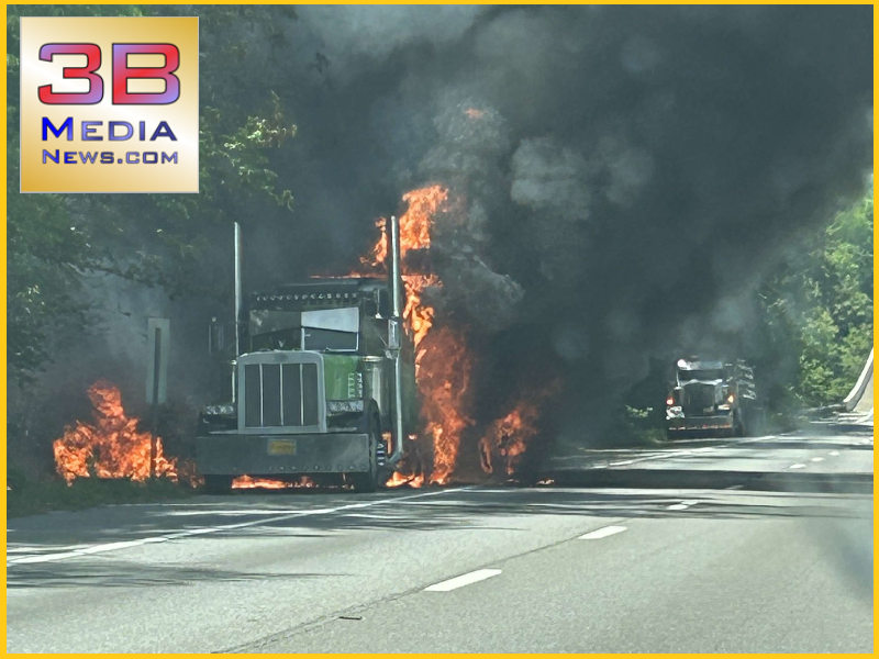 The driver is confirmed safe, and was able to get out of the burning truck. Allegedly, the truck was hauling metal or steel products.