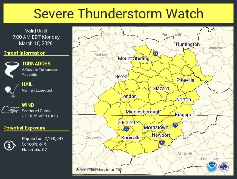 The watch covers parts of Kentucky, Tennessee, Virginia, and West Virginia. Forecasters say conditions may support a couple of tornadoes and scattered wind gusts up to 75 miles per hour.