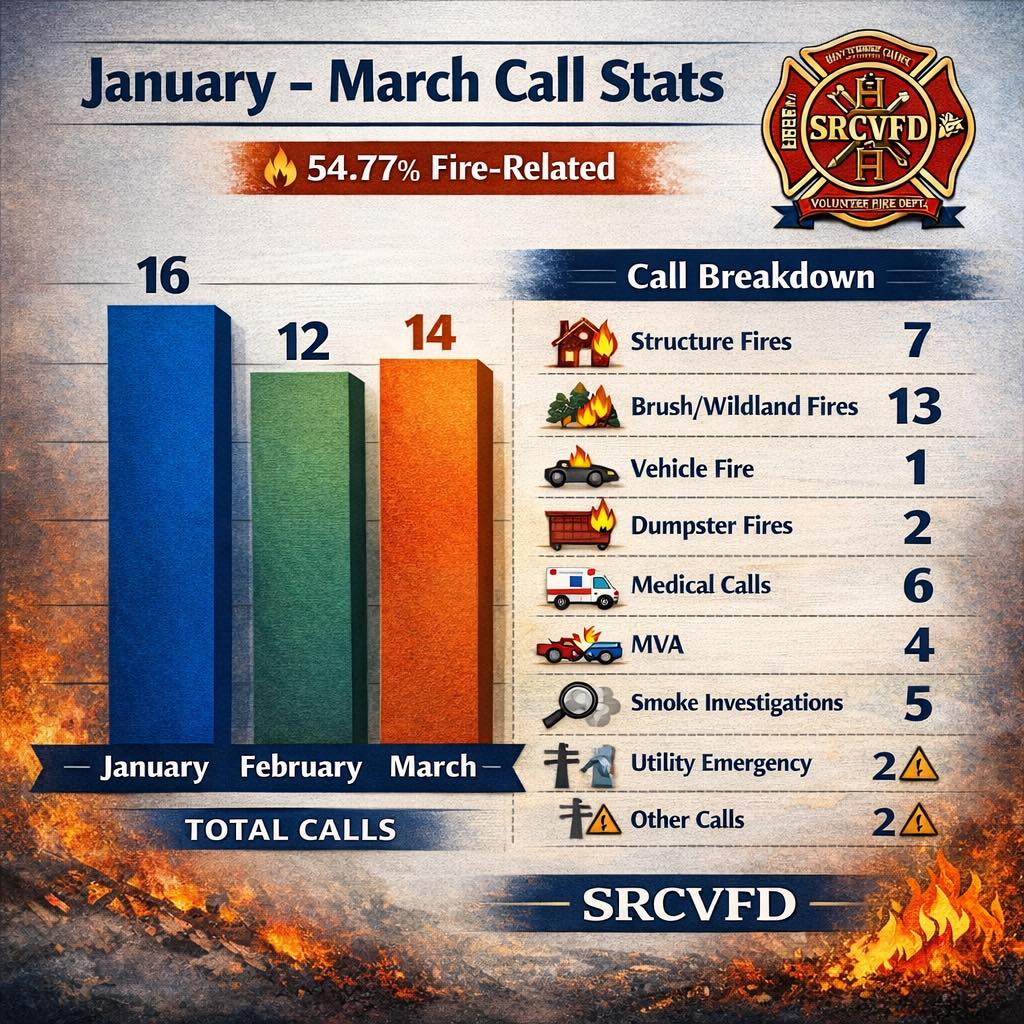 The South Roane County Volunteer Fire Department has wrapped up the first quarter of the year, noting that while overall call volume has remained fairly steady, a striking 54.77% of their calls were fire-related. This includes structure fires, brush and wildland fires, vehicle fires, and other incidents, meaning more than half of their emergency responses involved fires.