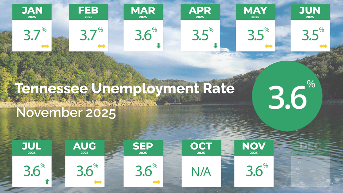 The State of Tennessee says that in November 2025, Tennessee’s labor market showed positive momentum as the state entered the holiday season. The seasonally adjusted statewide unemployment rate declined slightly by 0.1 percentage point from the previous year to 3.6%, reflecting a stronger workforce compared to November 2024.