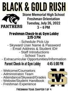 Stone Memorial High School Freshman Orientation will be Tuesday, July 26, 2022, from 3 PM-6 PM