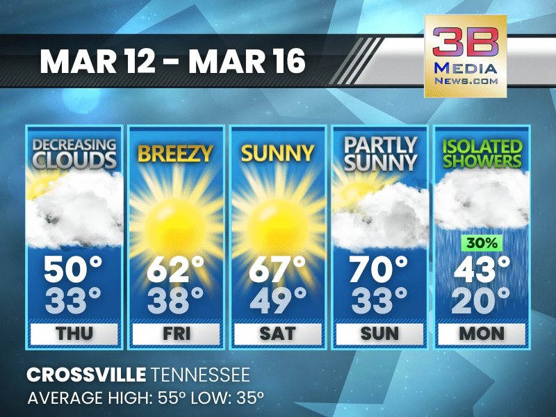 Weather information is provided by the National Weather Service in Nashville and Morristown. You can hear the latest forecast on 105.7 The Hog, 94.1 The Vibe (1410 AM), Spirit 101.9, 98.9 The Wolf, and 93.3 The Ranch (580 AM). Stay connected with Weather Reporter Johnny Caudle on social media by following him on Facebook, X, Instagram, Bluesky, and YouTube. You can also click here to send him an email.