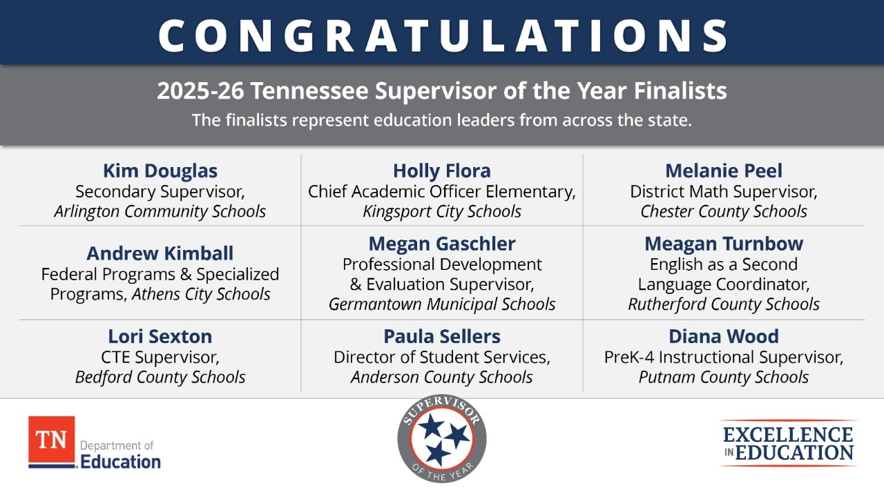 NASHVILLE, TN— Today, the Tennessee Department of Education announced the finalists for the 2025-26 Tennessee Principal of the Year and Supervisor of the Year awards. The finalists represent education leaders from across the state, with three finalists in each Grand Division: West, Middle, and East.