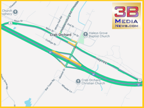 WRECKED UTILITY TRUCK ON I-40 AT CRAB ORCHARD EXIT CAUSING TRAFFIC DISRUPTIONS