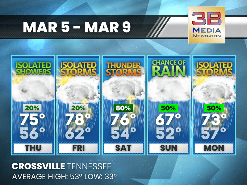 Weather information is provided by the National Weather Service in Nashville and Morristown. You can hear the latest forecast on 105.7 The Hog, 94.1 The Vibe (1410 AM), Spirit 101.9, 98.9 The Wolf, and 93.3 The Ranch (580 AM). Stay connected with Weather Reporter Johnny Caudle on social media by following him on Facebook, X, Instagram, Bluesky, and YouTube. You can also click here to send him an email.