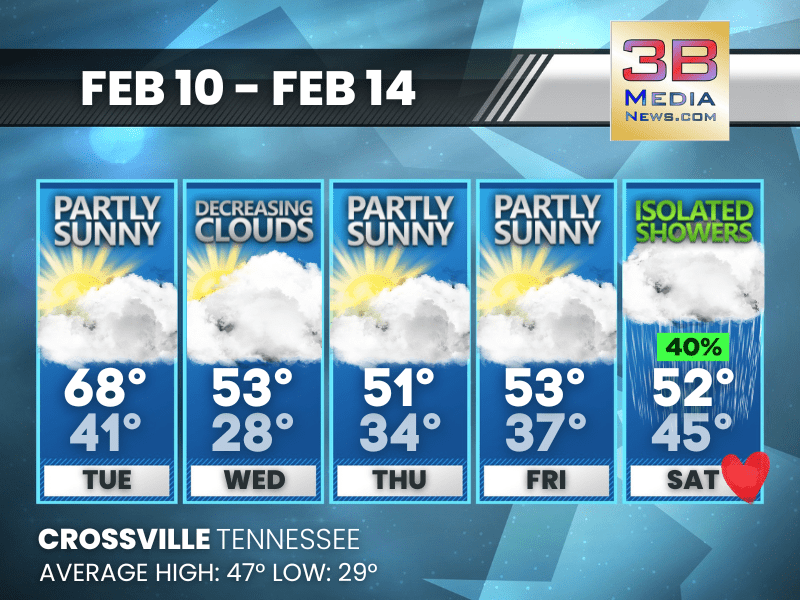 Weather information is provided by the National Weather Service in Nashville and Morristown. You can hear the latest forecast on 105.7 The Hog, 94.1 The Vibe (1410 AM), Spirit 101.9, 98.9 The Wolf, and 93.3 The Ranch (580 AM). Stay connected with Weather Reporter Johnny Caudle on social media by following him on Facebook, X, Instagram, Bluesky, Mastodon, TikTok, YouTube, and Threads. You can also click here to send him an email.