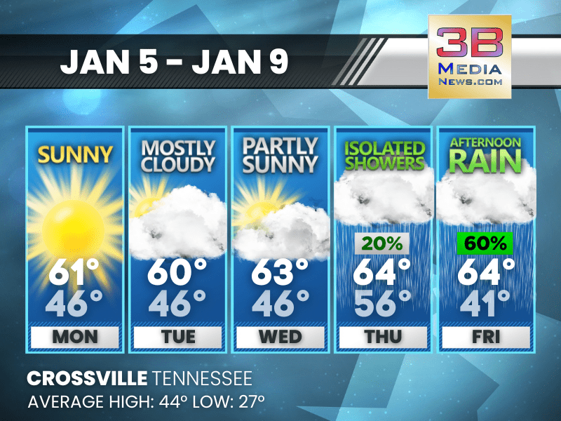 Crossville warms into the low to mid 60s through midweek before rain chances increase late Thursday into Friday.