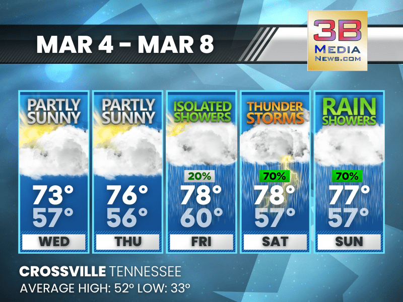 Weather information is provided by the National Weather Service in Nashville and Morristown. You can hear the latest forecast on 105.7 The Hog, 94.1 The Vibe (1410 AM), Spirit 101.9, 98.9 The Wolf, and 93.3 The Ranch (580 AM). Stay connected with Weather Reporter Johnny Caudle on social media by following him on Facebook, X, Instagram, Bluesky, and YouTube. You can also click here to send him an email.
