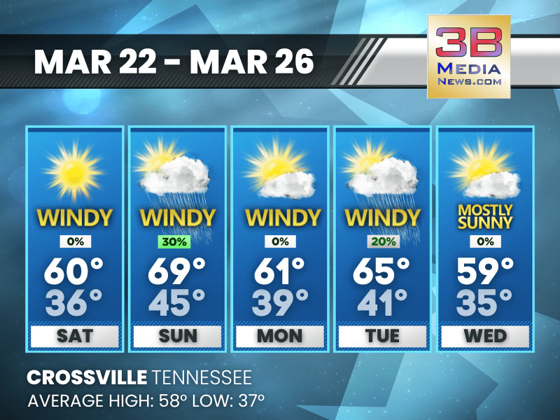 Weather information is provided by the National Weather Service in Nashville and Morristown. Hear the latest forecast on 105.7 The Hog, 94.1 The Vibe (1410 AM), Spirit 101.9, 98.9 The Wolf, and 93.3 The Ranch (580 AM). Get connected with Weathercaster Johnny Caudle on social media. Follow him on Facebook, X, Instagram, Bluesky, and Threads. Click here to send him an email.